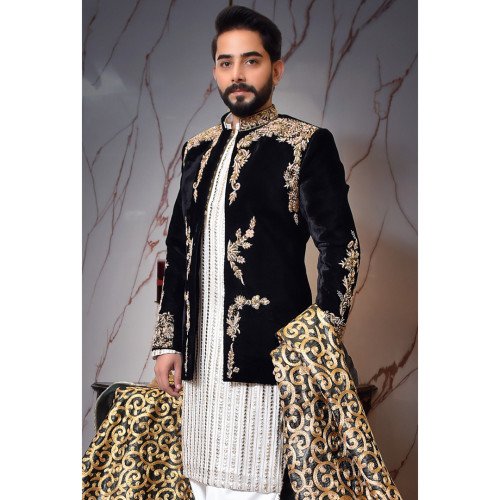 Adorned with delicate gold-leaf embroidery, this outfit is designed for the man who wants to exude elegance at every celebration.