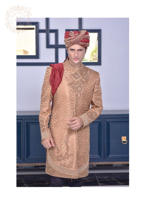 Content: A tribute to tradition. This golden-copper sherwani features a unique paisley self-print and intricate heritage embroidery on the neckline and daman. Paired with a deep maroon turban and shoulder drape, it offers a rich, regal aesthetic.
