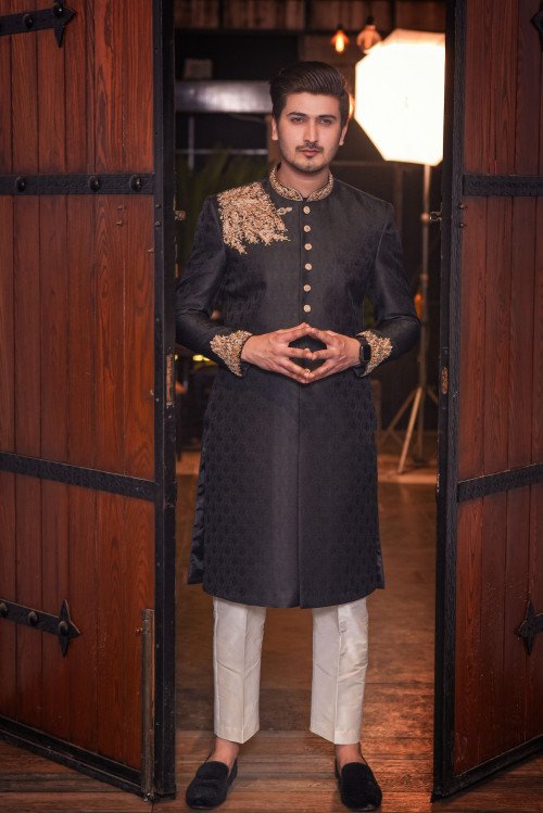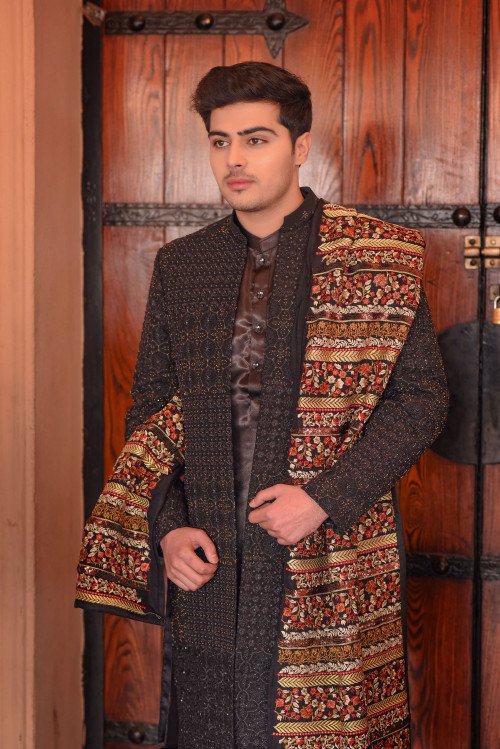 : "Step into the spotlight with an aura of mystery and strength. Hamza Collection Men's Wear presents the Midnight Monarch—a deep charcoal Sherwani featuring intricate tonal embroidery. Paired with a vibrant, heritage-inspired shawl, this ensemble is designed for the man who leads with elegance. Your big day deserves nothing less than royal perfection."
