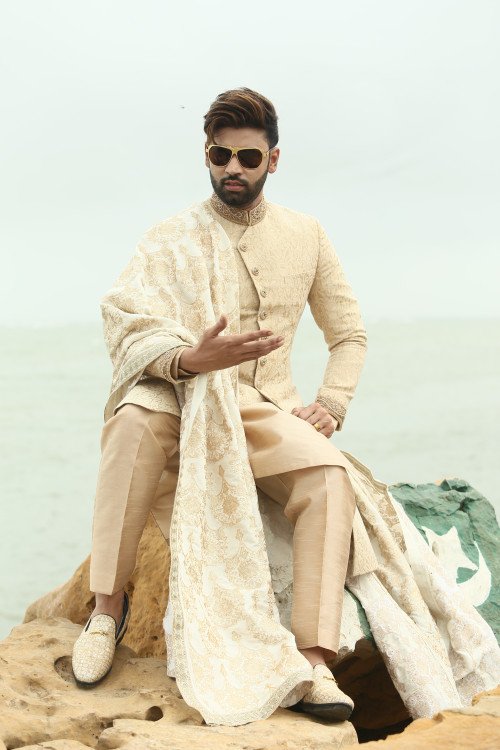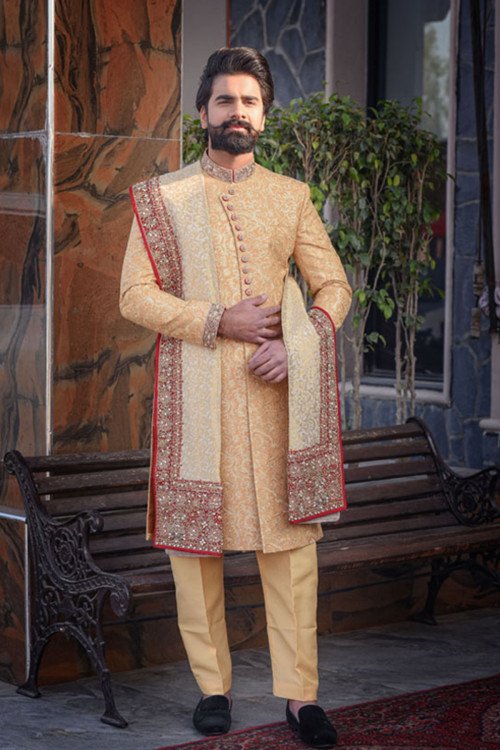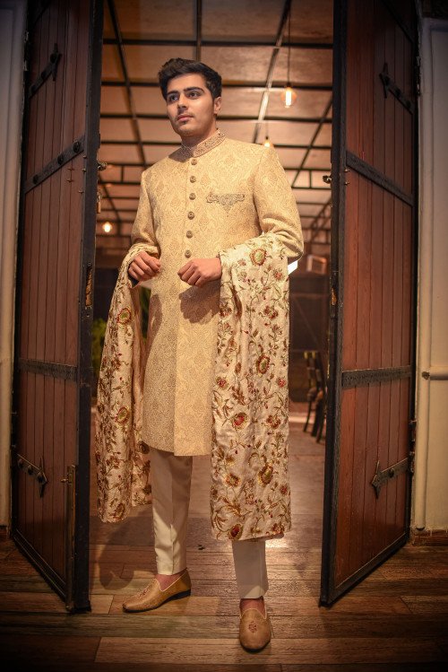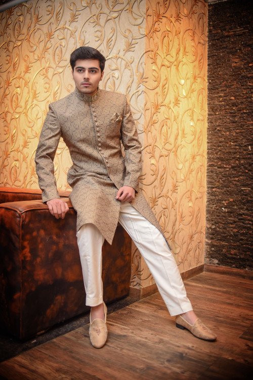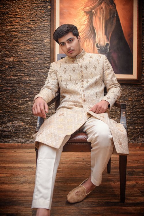 Crafted for the modern groom who values tradition, this masterpiece features intricate hand-embroidered textures and a seamless fit that commands attention. Make your big day unforgettable with a look that speaks of timeless class."