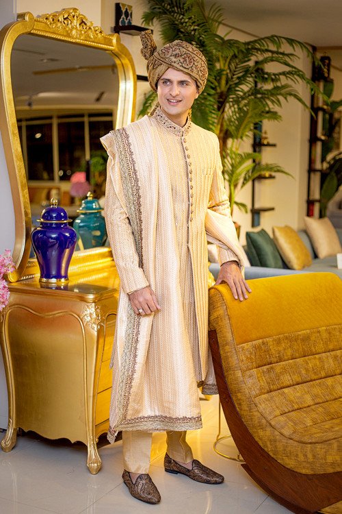Title: Luxurious Cream Embroidered Sherwani with Royal Turban
