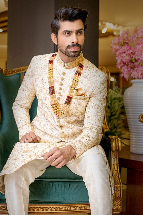 Content: Define elegance on your special day with this masterpiece from Hamza Collection. This ivory-toned sherwani features intricate tone-on-tone embroidery and a sophisticated gold-trimmed collar. Paired with a majestic pleated turban, it is the ultimate choice for a classic Nikkah or Barat look.