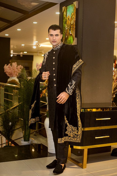Description: Command attention in this jet-black ensemble. Adorned with gold zari embroidery on the shoulders and cuffs, and complemented by a premium velvet shawl, it is the ultimate statement of luxury.