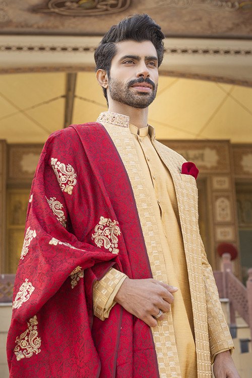 Experience the grandeur of tradition with Hamza Collection. This ensemble is designed for the groom who wants to balance a rich, golden aesthetic with the deep, soulful tones of a heritage shawl.