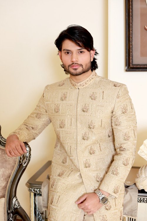 This ivory sherwani is designed for the groom who appreciates a balanced aesthetic—combining a soft, regal color palette with highly detailed, structured embroidery.