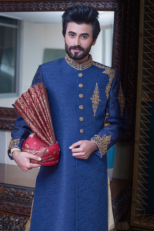 Make a powerful statement with Hamza Collection. This royal blue sherwani is the perfect choice for the groom who wants to combine modern boldness with traditional regal flair.