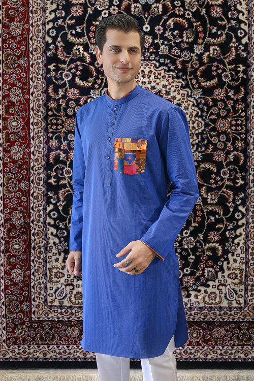 "Experience the perfect blend of luxury and comfort. 💎 Hamara royal blue kurta na sirf dikhne mein shandaar hai, balkay iska internal astar (lining) isay pura din pehn-ne ke liye intehai comfortable banata hai. Self-pattern embroidery aur classic silhouette ke saath, yeh aapki wardrobe ka sab se behtareen hissa banne wala hai.